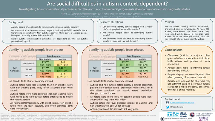 Introduction. Social and communication impairments are part of the diagnostic criteria for autism, but recent research has shown that social interaction and communication between autistic people are enjoyable for participants and efficient at transferring information. This suggests that autistic social/communicative “impairments” are dependent on the neurotype of the other member(s) of the interaction – as per Milton’s double empathy problem. This may make it more difficult for observers to accurately identify someone as autistic when they are interacting with another autistic person. Methods. We hypothesised that autistic people are easier to identify as autistic when interacting with non-autistic people. To test this, 78 raters (39 autistic; 39 non-autistic) watched clips from videos showing autistic dyads, non-autistic dyads, and mixed dyads conversing, and were asked to identify whether each member of the dyad was autistic. A subset of 54 participants repeated this procedure with photographs of dyads in conversation. Results. Raters correctly identified the neurotype of dyad members at a rate better than chance for videos (0.58, p<0.001) and photographs (0.55, p<0.001). However, accurate identification for autistic dyads was significantly below chance for both videos (0.34, p<0.001) and photographs (0.27, p<0.001). For videos, ratings of mixed dyads had the highest accuracy (non-autistic raters 0.71 p<0.001; autistic raters 0.88 p<0.001); for photographs, non-autistic dyads had the highest accuracy rate overall. For videos, both autistic and non-autistic raters showed an own-neurotype accuracy effect across all dyad types (autistic raters outperformed non-autistic raters for autistic and mixed pairs; the opposite for non-autistic pairs). Discussion. This research provides tentative further support for the double empathy problem – a non-stigmatising and neurodiversity-oriented understanding of autistic social communication. However, further research with a larger sample size is required to support the robustness of the findings reported here. Better understanding of whether and how autistic people recognise one another could lead to improvements in how we identify/diagnose autism, by providing insight into what autistic people intuitively understand as being ‘autistic behaviour’.